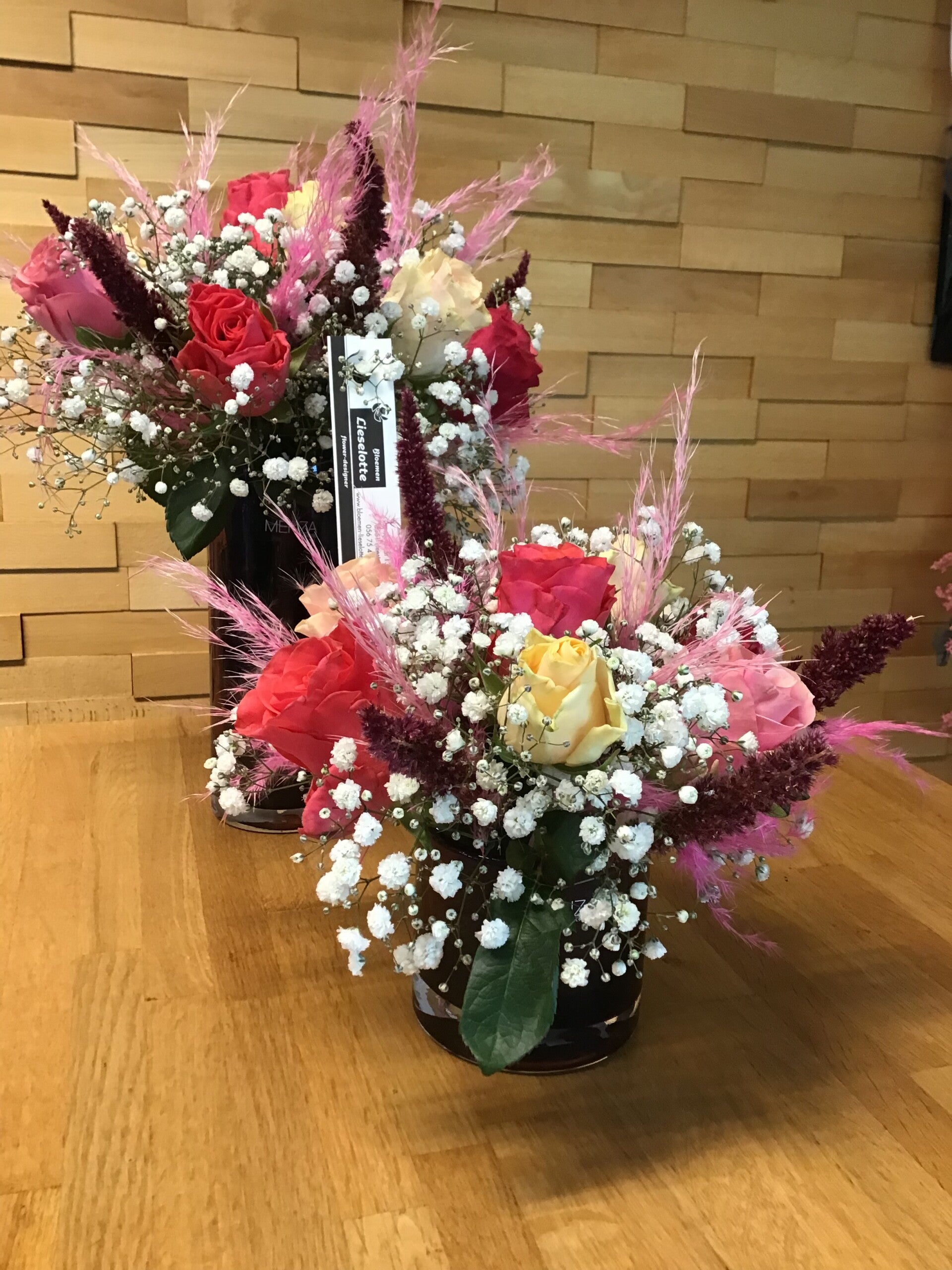 Deze bloemstukken zijn opgewerkt in glas van Menza .